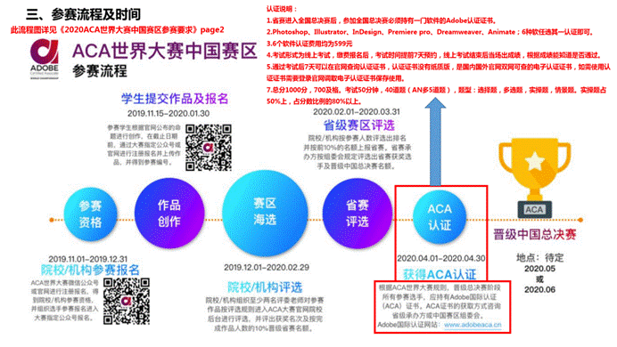 3.省赛及以后的参赛流程及时间,参考下面图片(请注意,省赛胜出进入国赛的选手,需要持有一门软件的Adobo认证证书,具体要求详见图示说明)。