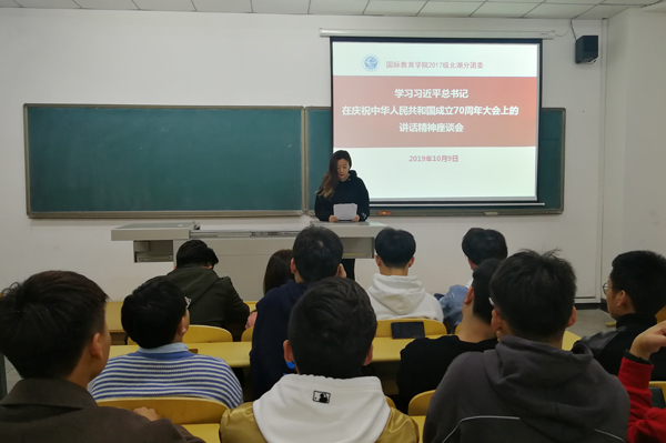 团委副书记许嘉纯就热爱伟大祖国、树立理想信念、学习专业技能、培养综合素质等方面谈了作为新时代大学生如何贯彻落实习近平总书记重要讲话精神;2016级团支部书记代表孙鑫瑶、2017级团支部书记代表高迪、2018级团支部书记代表刘禹伽、2019级学生代表马赫聪等分别结合自身对祖国70年伟大发展成就的认识,从七十年风风雨雨,到七十年历经磨难,再到七十年砥砺前行,从公路通达、桥梁纵横,到“新四大发明”惊艳世界,从“一带一路”架起亚欧沟通桥梁到今日祖国之强盛,每名同学在发言时心情都无比激动。他们围绕学习、生活实际,表示在中国特色社会主义新时代,要通过不懈努力奋斗,坚定人生理想,树立远大目标,贡献自己的青春力量,肩负起实现中华民族伟大复兴的时代重任。
