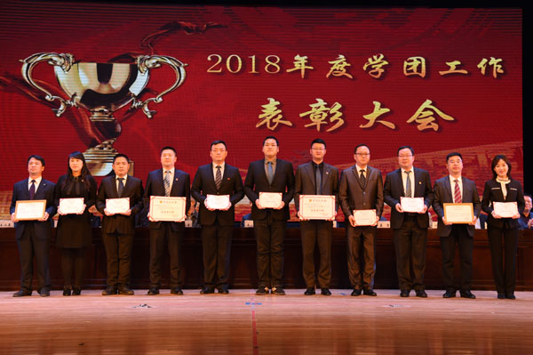 优秀专职团干部于伟(右五)、优秀学生政工干部李强(右三)上台领奖
