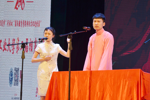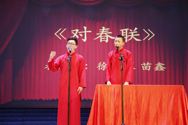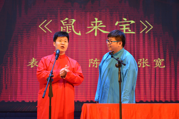 的大三学生,从小喜爱相声,曾受相声教育家王祥林等先生的指点,曾登上2017年吉林省草根春晚的舞台。这一次他和搭档为观众表演了三段相声,特别是新作《环游世界》(传统相声名为《地理图》)的大贯口功底深厚、一气呵成,让在场观众大呼过瘾。最后登场的房鹤迪、太荣剑老师的底活则让大家见识到相声演员的真功夫。整台演出真可谓是“传统文化进校园,博大精深真体验,说学逗唱技艺精,欢声笑语掌声连”。